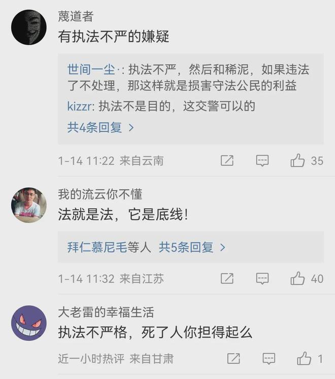 虽然有人把“执法不严”和“死了人需要承担责任”联系成因果关系,看起来很荒诞,但似乎也看到了对执法交警的一丝关心。