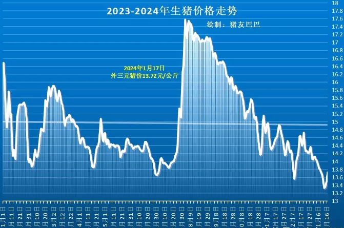 从最新数据分析,1月17日,外三元生猪价格呈现“4连涨”的走势,全国生猪均价从13.33元涨至13.72元/公斤,虽然,距离成本线仍有一定的距离,但是,得益于育肥成本下降,养殖户亏损的压力也逐步缓解。