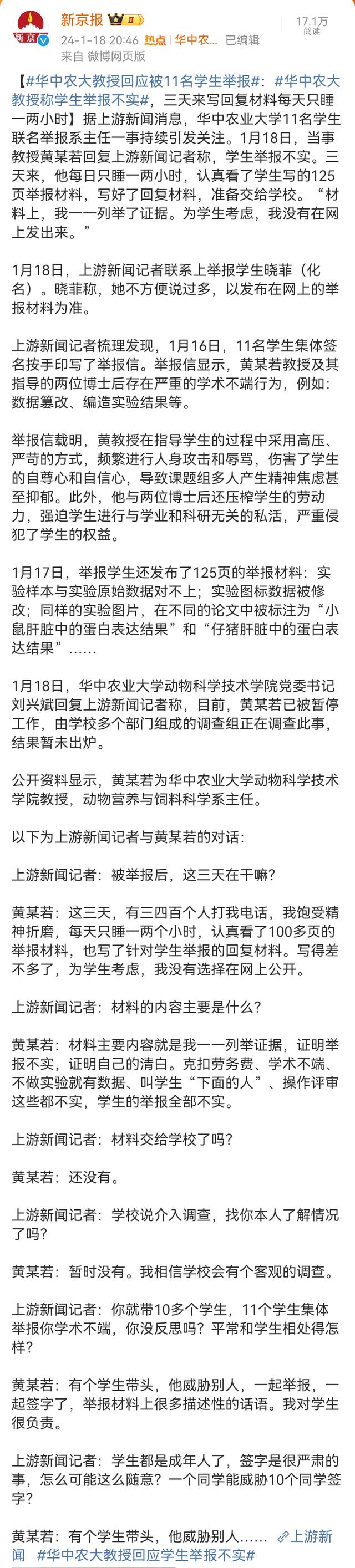 1月18日,据新京报报道(文末附报道全文),上游新闻记者采访了被举报的华中农大的黄教授。黄教授称,关于网络上流传的举报材料全部不实,这三天来他每天只睡一两个小时,所有的时间都在写回复材料。