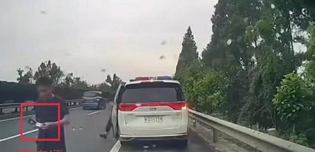 警车停下后,从车上下来一位男子,立刻拿出了警官证,走向私家车车主。