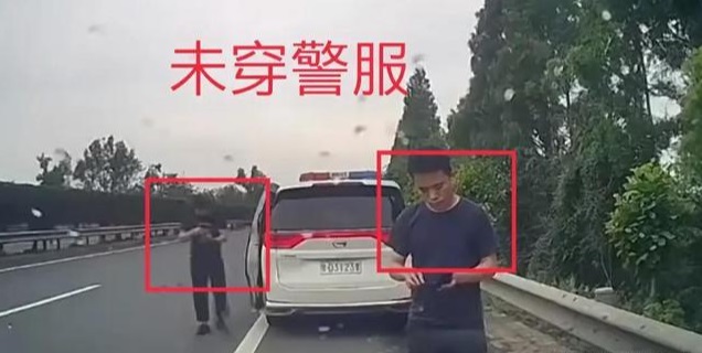 随后拿着驾驶证和行驶证,对该私家车进行核对,我们看到,警车下来的两位人员都没有穿警服,这是否符合规定?执法是否符合规范?