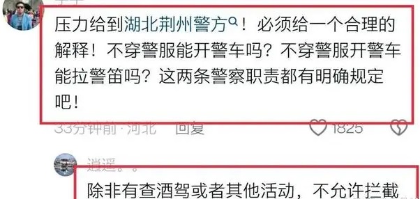 网友表示,压力给到湖北荆州警方,必须给一个合理的解释,不穿警服能开警车吗?不穿警服开警车能拉警笛吗?这两条都是有明确的规定的,认为他们应该是违规了。