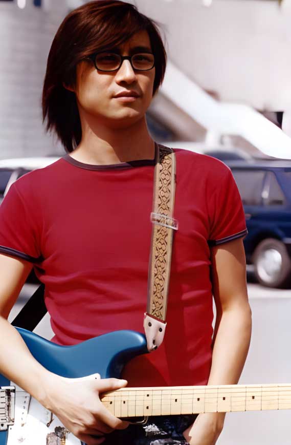 相反,他迷上了吉他,留着长长的头发,穿着贴身的衣裤,背着一把吉他。