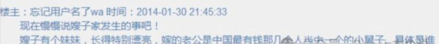 帖子主人声称,自己嫂子的妹妹长得十分漂亮,嫁的老公是中国最有钱的那几个人当中一个小舅舅。