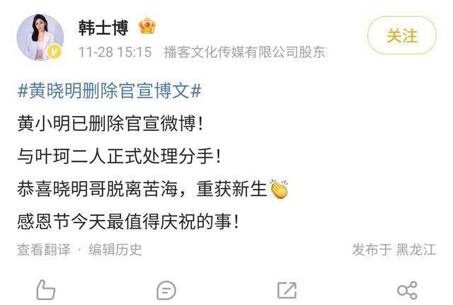 所以这次黄晓明删除和叶珂的文案,很多网友都猜测是两人感情出了问题,也就是分手了……