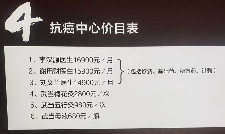药王谷中医馆抗癌中心价目表显示的各类诊疗费用。受访者供图