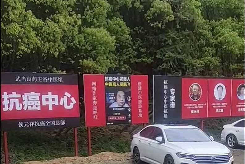 视频中,药王谷中医馆停车场一块红底白字的“抗癌中心”牌子格外醒目,一旁是六名中医抗癌专家和六名导医的宣传牌。宣传牌一字排开,每块牌子约2平方米,上半部为专家或导医的头像,下面是简介,每个专家名头都有“中医抗癌专家组成员”几个字。