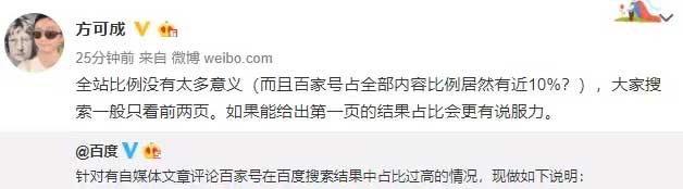 百度回应后,“搜索引擎百度已死”文章作者方可成认为:全站比例没有太多意义,大家搜索一般只看前两页,如果能给出第一页的结果占比会更有说服力。