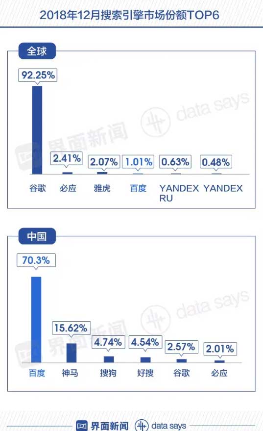 美国网站通讯流量监测机构StatCounter数据显示,2018年12月,百度在中国搜索引擎市场占有率超过70%,而全球市占率仅有1%。它的竞争对手谷歌,全球市占率达到92%,中国市占率仅有2.57%。