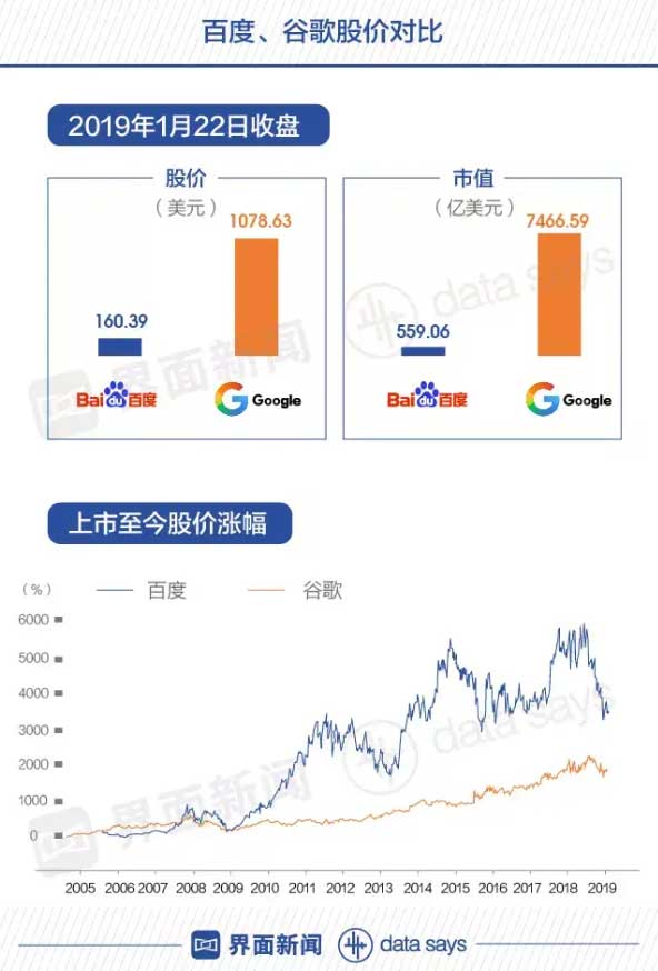 截至1月22日收盘,百度市值约为559亿美元,约为谷歌市值的1/13。