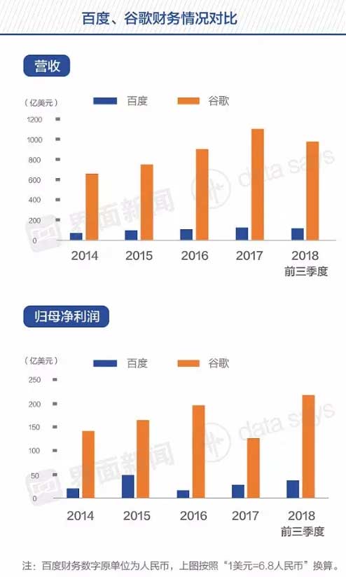 2017年,谷歌营收总额超过1100亿美元,是百度的8.9倍;谷歌归母净利润为126.6亿美元,是百度的4.7倍。