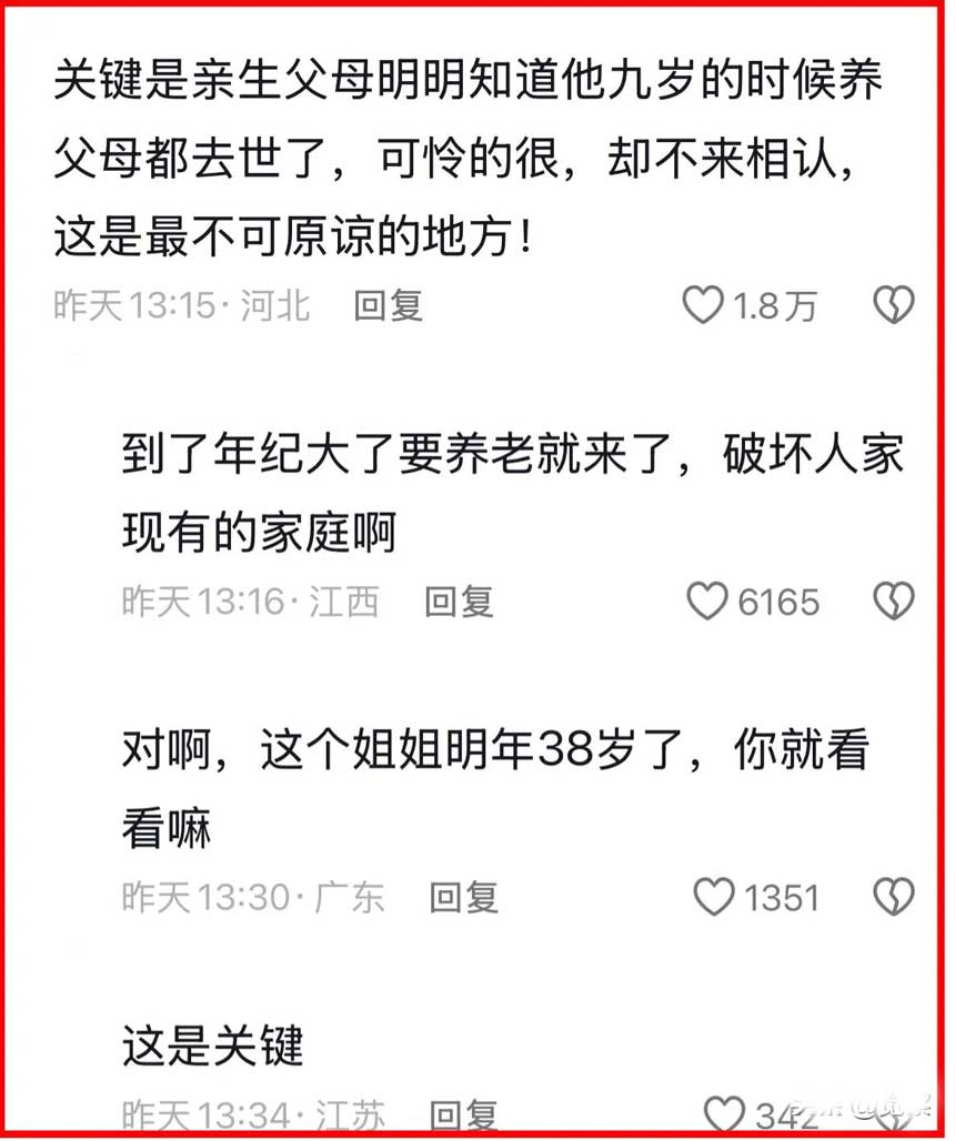 而且,女子9岁的时候养父母就不在了,那时候,他们为什么不来接女子回家,现在跑出来要认亲,动机不纯。