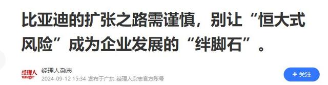 信息来源:经理人杂志 - 《比亚迪的扩张需谨慎,切忌让“恒大式风险”成为企业发展的障碍。》