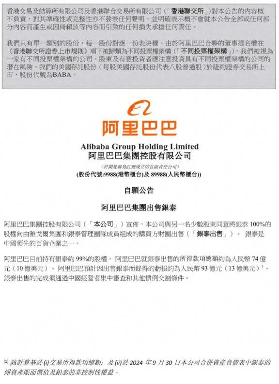 12月17日,阿里巴巴集团发布公告,称“同意将所持全部银泰股权以约74亿元人民币向雅戈尔集团和银泰管理团队成员组成的买方财团出售(约占银泰股权的99%)。”这意味着阿里巴巴将面向未来持续聚焦核心主业。同时,阿里方面表示,期待银泰在雅戈尔集团的支持下继续创业,打开更大发展空间。