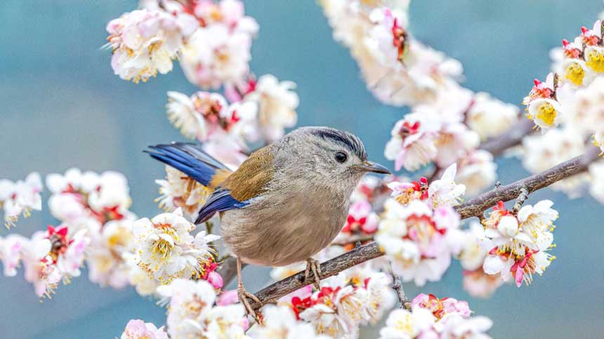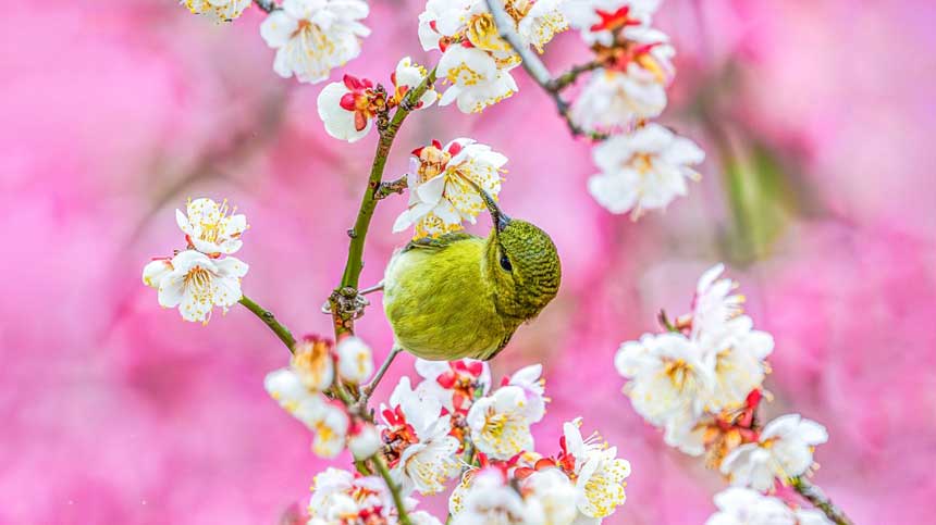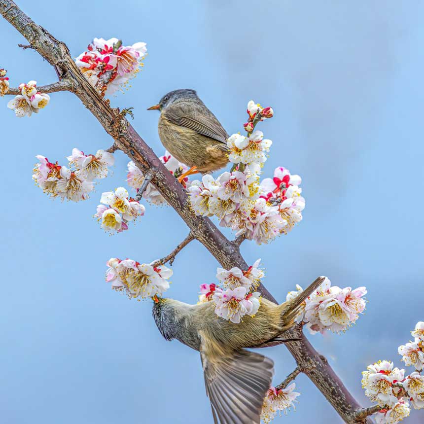 2025年2月16日,南川区大观镇梅华园,鸟儿在梅花间飞舞、嬉戏