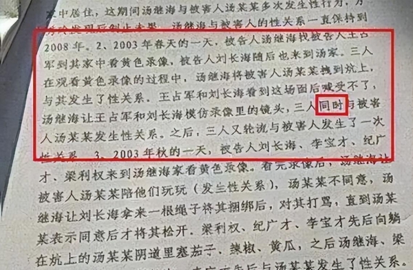 2010年,黑龙江省黑河市人民法院出具了第一份判决书,其中记录了全部的犯罪细节,对于母亲万秀玲的描述,更是让人气愤到了极点,2006年春天,汤继海邀请邻居到家中观看不良碟片,并对他们说:让我姑娘陪你俩玩玩,万秀玲听到后不仅没有阻止,反而还说:玩玩得给钱,并收了他们每人50块钱。