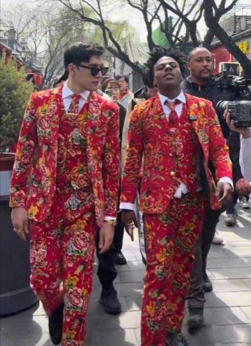 在成都之行中,两人同穿东北大花的西装在街头直播,瞬间吸引了不少人。