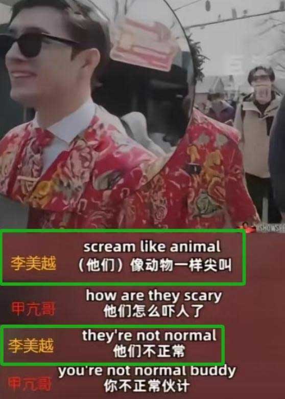 但是没想到,他们热情的呼声竟成了李美越嘴里的“像动物一样尖叫”,还说他们不正常。
