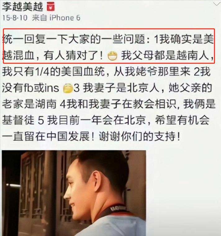 李美越曾发布过自己是美国和越南混血的言论,他的名字就是最好的证明。