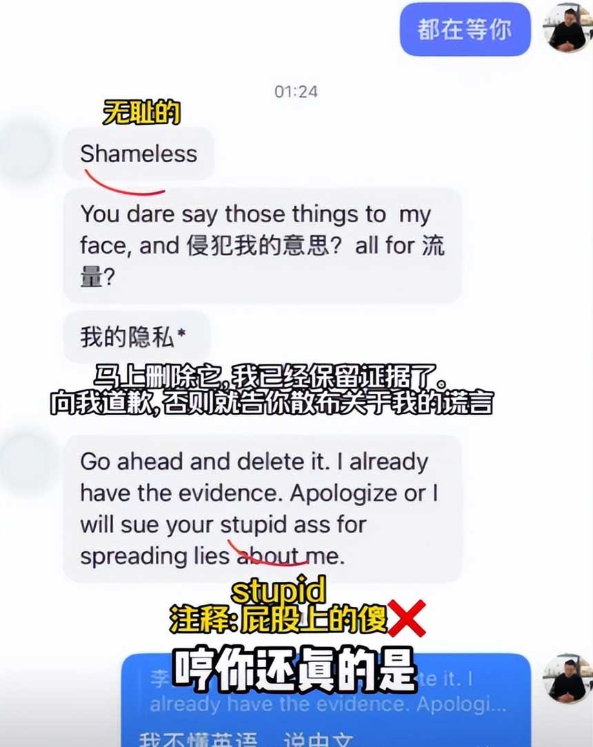 但没想到李美越竟狂得没边儿,甚至还不可一世地私信威胁起别的爱国网红了。