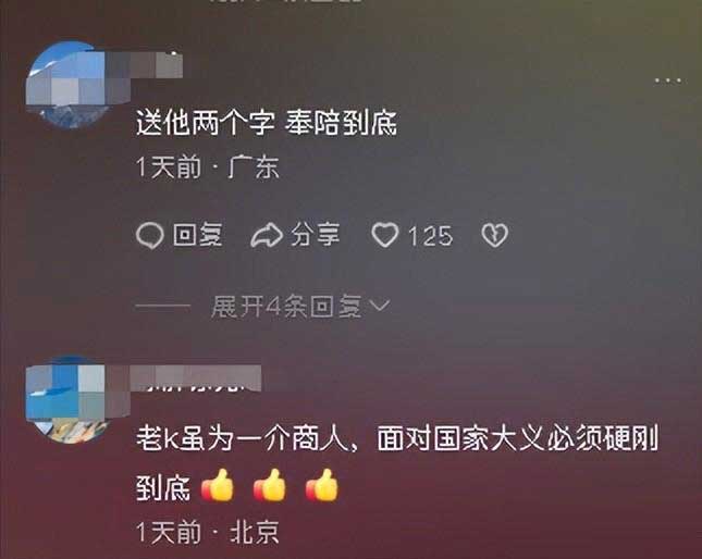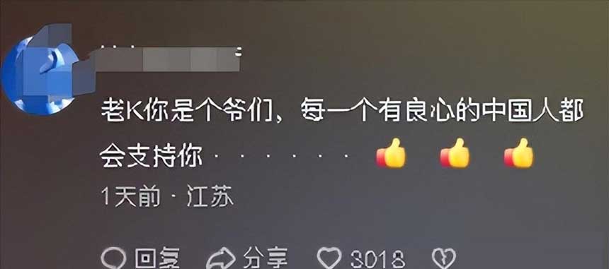 “老k,你是个爷们,每个有良心的中国人都会支持你的。”