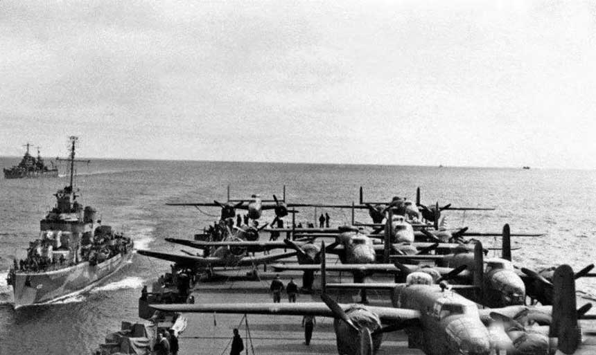 于是,大家研究之后决定,首先用“大黄蜂号”航空母舰将B-25远程轰炸机送到距离日本本土不到400海里的范围内,等他们完成对日本的轰炸任务后,再飞到1500海里之外的中国机场降落加油。