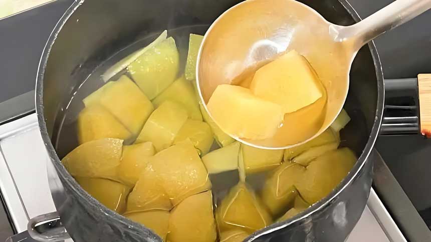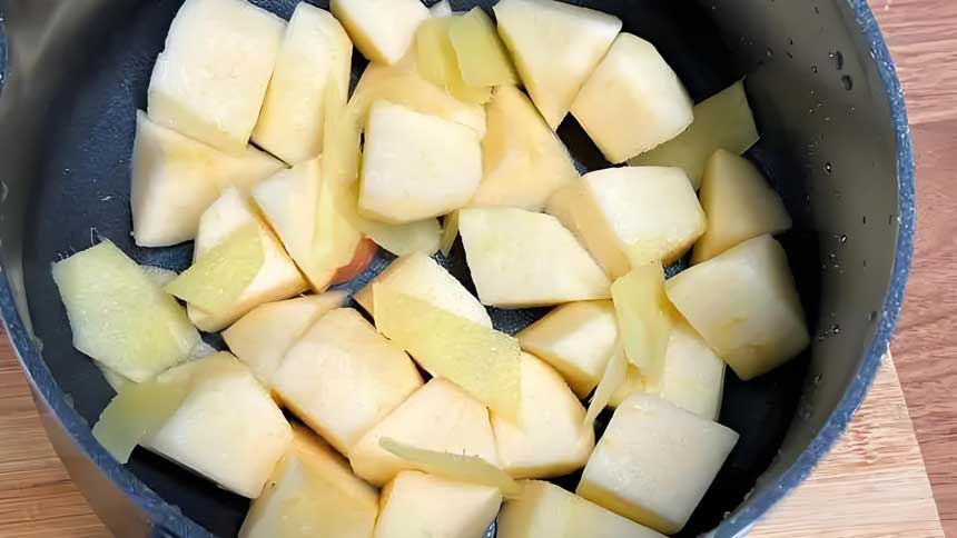 3、煮到苹果"开花":保持小火煮15分钟左右,看到苹果块边缘变得透明,用勺子轻轻一压就软烂的状态就可以关火了。这里有个秘诀——关火后别急着掀盖子,焖5分钟能让苹果的果香完全释放。