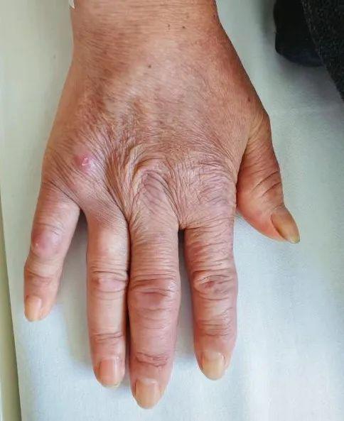 数月前,张阿姨在一次洗鱼时,手指曾被鱼刺刺伤,当时做了伤口清理和消毒,伤口很快自行愈合,就没当回事。另外,医生了解到张阿姨正在口服免疫抑制剂药物。基于这些信息,初步断定张阿姨手部肿胀是因为感染。