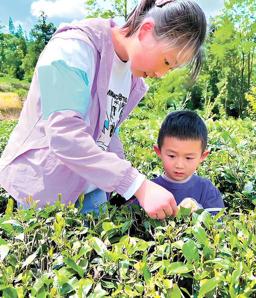 春假里,恩施州利川市一名中学生带着弟弟体验采茶。利川市委宣传部供图