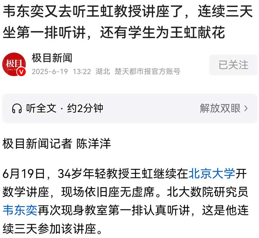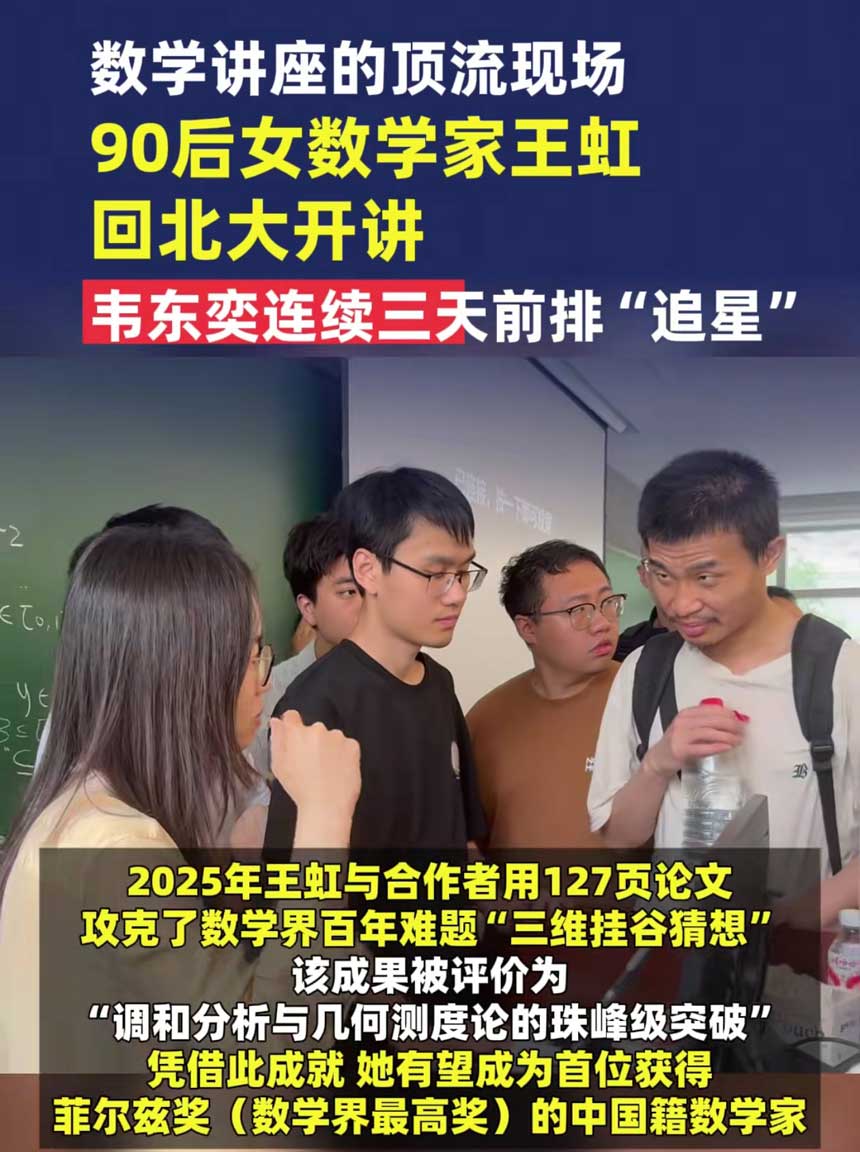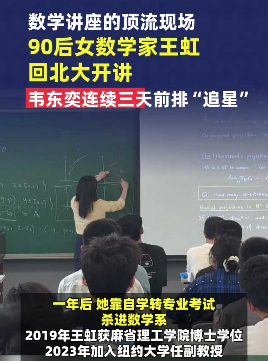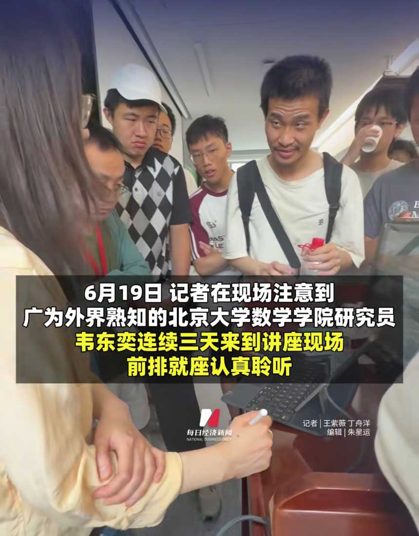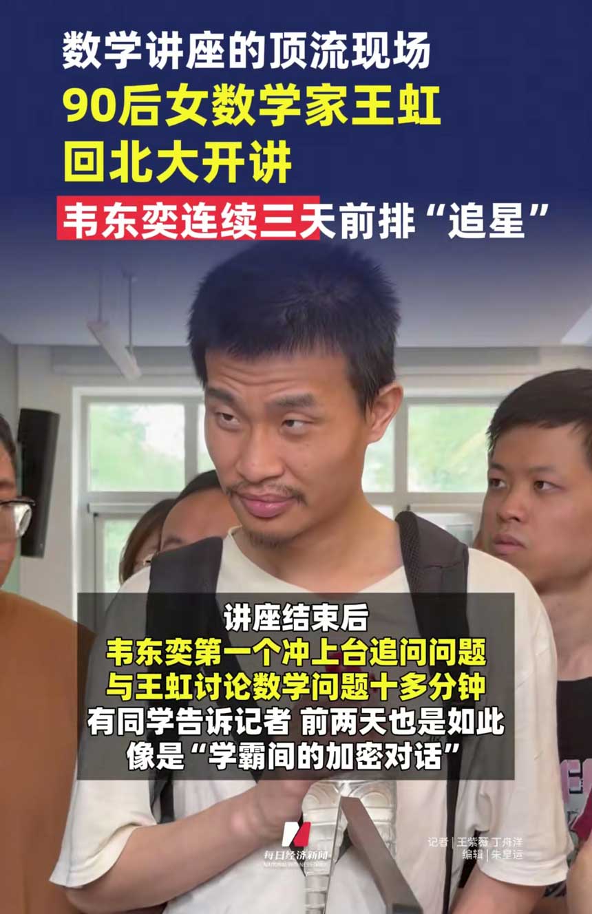 近日,北大数院校友王虹回到母校讲学,和师生分享自己的最新研究成果,作为同龄人的韦东奕,连续三天都抽时间过来听讲,而且还选择了第一排的位置。