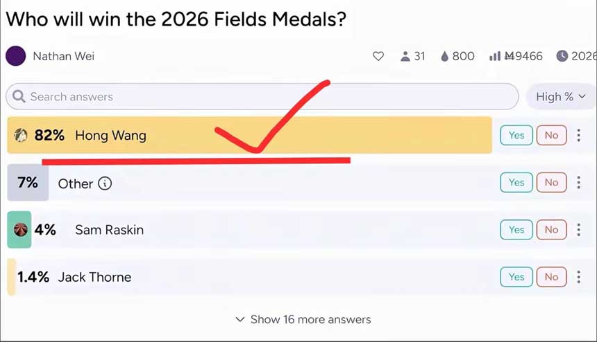 业界调查数据显示,王虹获得2026年菲尔兹奖的概率正在不断提升,达到了82%,远远超过其他人。