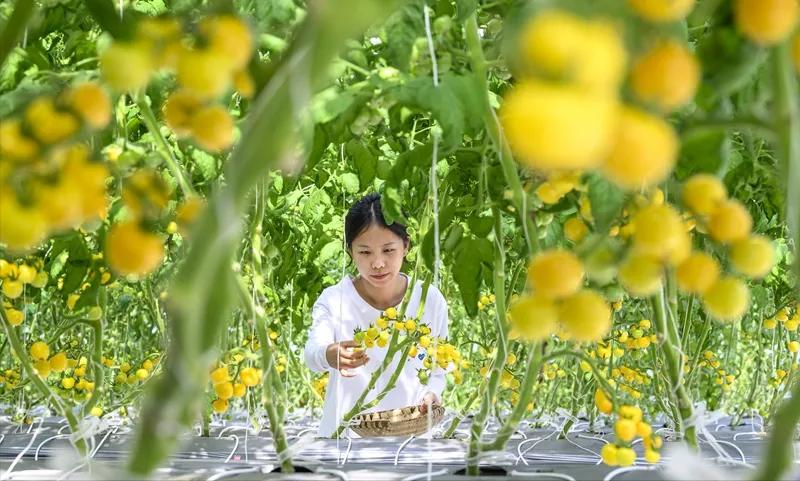 游客在滕春蔬菜种植智慧工厂采摘番茄。记者 甘昊旻 摄