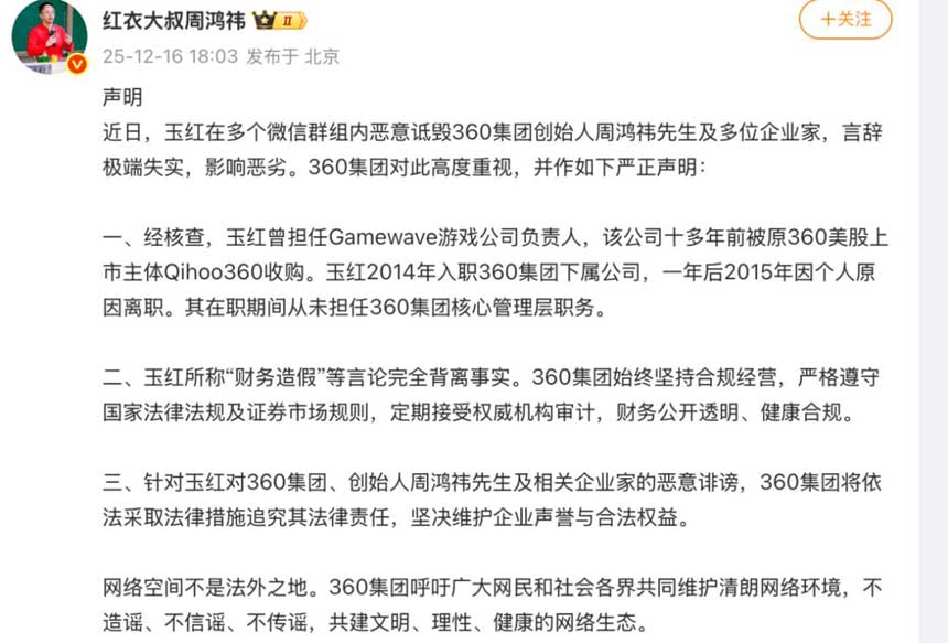 对此,周鸿祎通过微博否认“财务造假”一事。“经核查,玉红曾担任Gamewave游戏公司负责人,该公司十多年前被原360美股上市主体Qihoo360收购。玉红2014年入职360集团下属公司,一年后2015年因个人原因离职。其在职期间从未担任360集团核心管理层职务。”周鸿祎称,360集团将依法采取法律措施追究其法律责任,坚决维护企业声誉与合法权益。