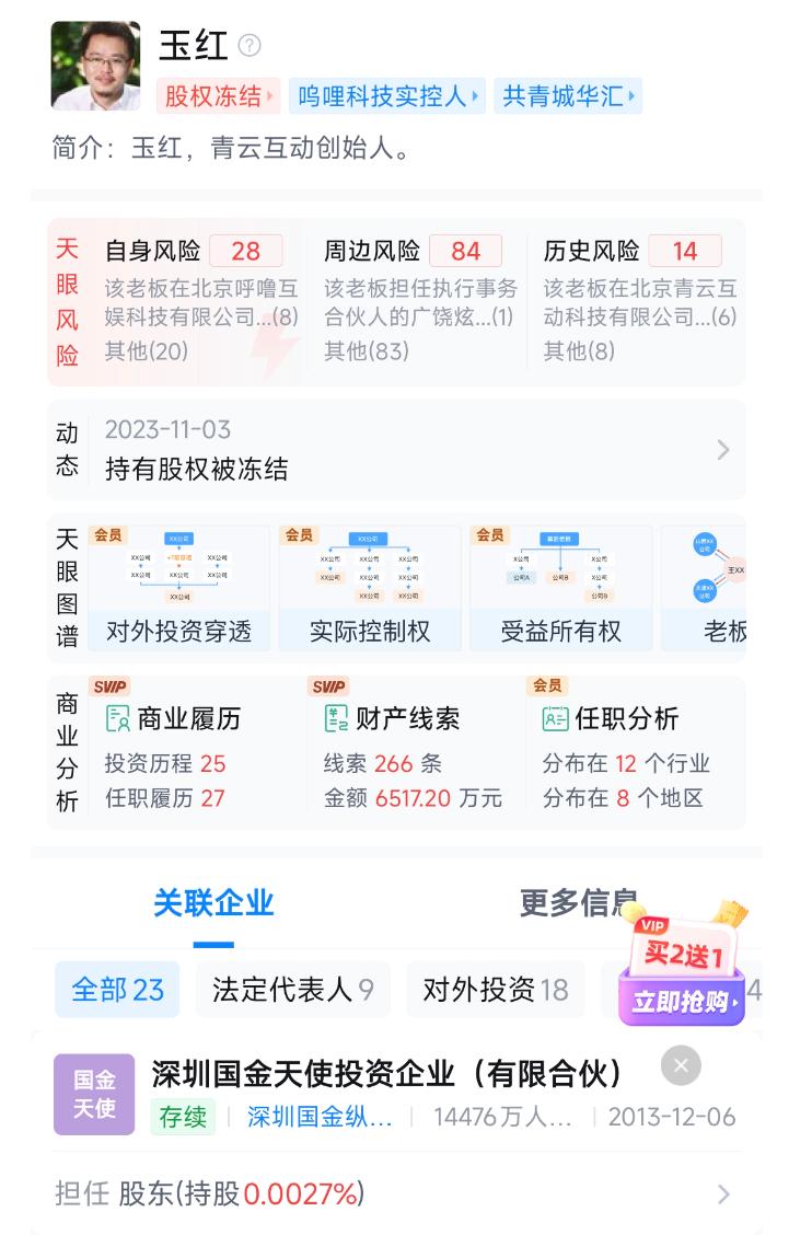 天眼查显示,玉红目前任职的23家企业中,多家已被吊销或其持有的股份被冻结。
