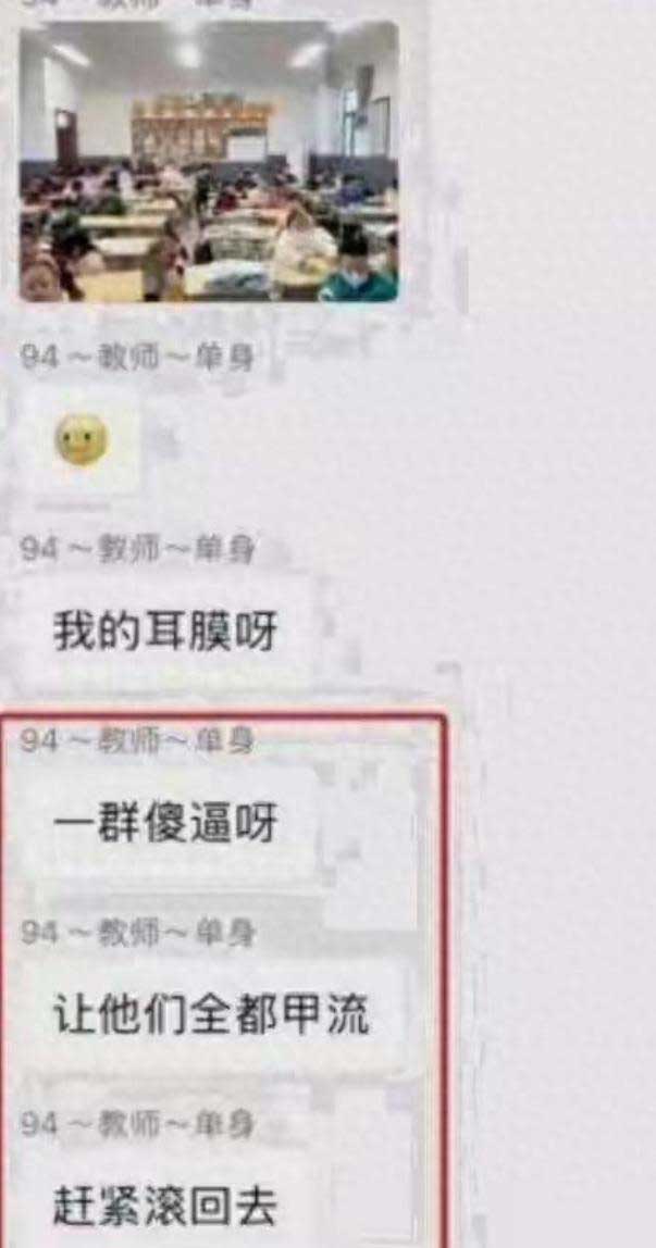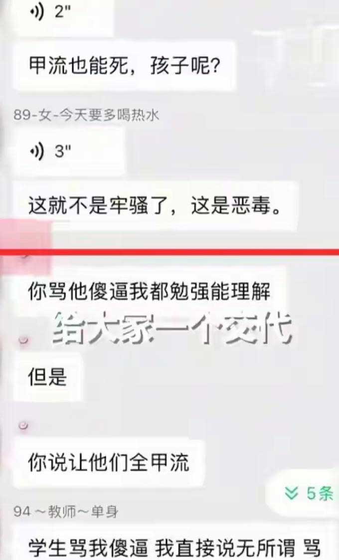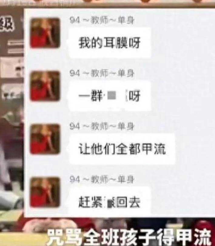 先说聊天记录里最刺眼的那句。12月15日晚上,在陕西铜川一个一百来人的微信相亲群里,有人晒出一段对话。一个自称是小学音乐老师的女人在群里不停吐槽,说一年级的小孩太吵、太闹。吐着吐着,她突然来了一句狠话:“让他们全都甲流,赶紧滚回去。”