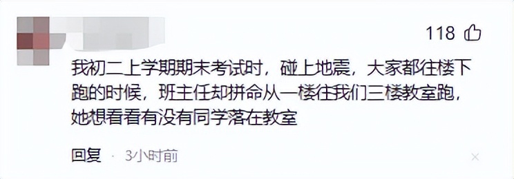 网友热议:我初二上学期期末考试时,碰上地震,大家都往楼下跑的时候,班主任却拼命从一楼往我们三楼教室跑,她想看看有没有同学落在教室