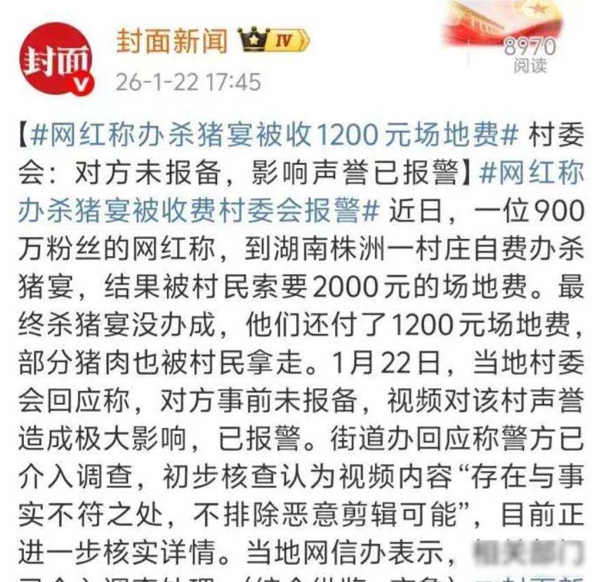 网红团队自费买猪办宴席,村民持镰刀要钱,警方称视频可能剪辑过