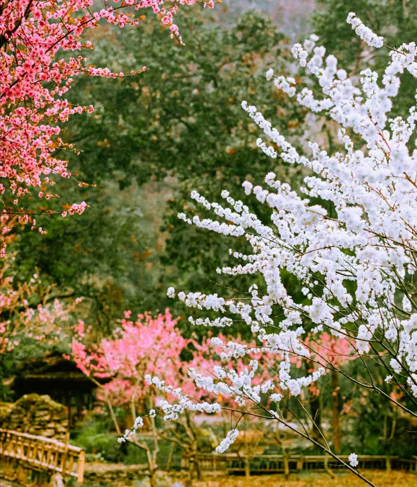桃花一到花期,山谷里一层粉一层白,拍照不用滤镜都像开挂。