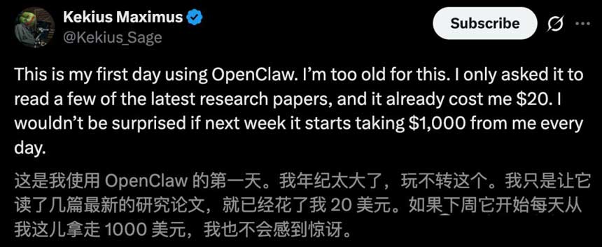 同在今天,大佬Kekius Maximus在社交平台上分享了使用OpenClaw首日体验,瞬间感叹道:
