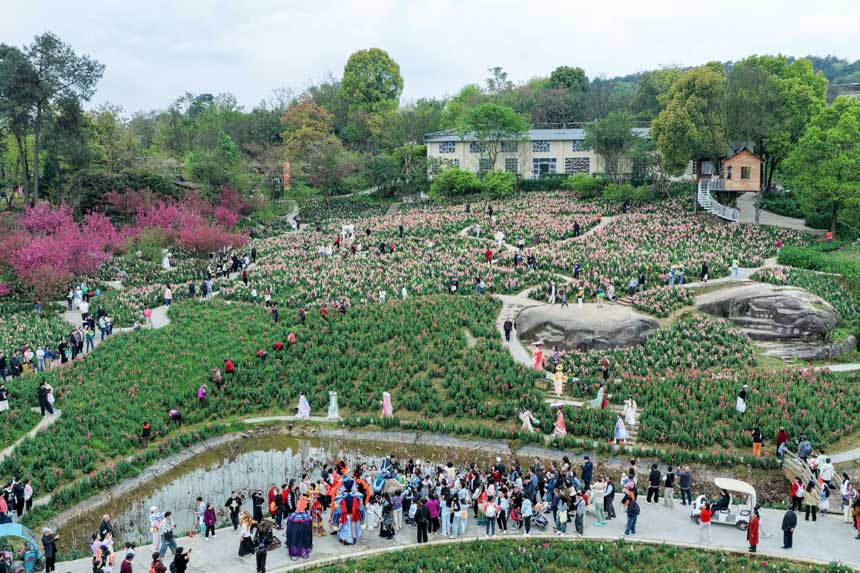3月22日,在重庆市巴南区二圣镇集体村云林天乡景区,工作人员在金鱼草花海中表演。
