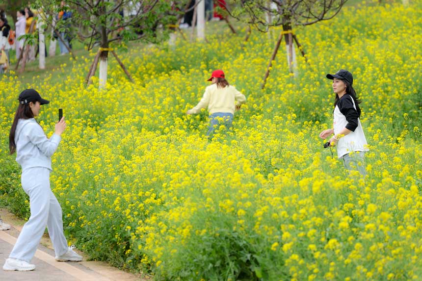 3月22日,在重庆市巴南区二圣镇集体村云林天乡景区,游客在油菜花丛中拍照。