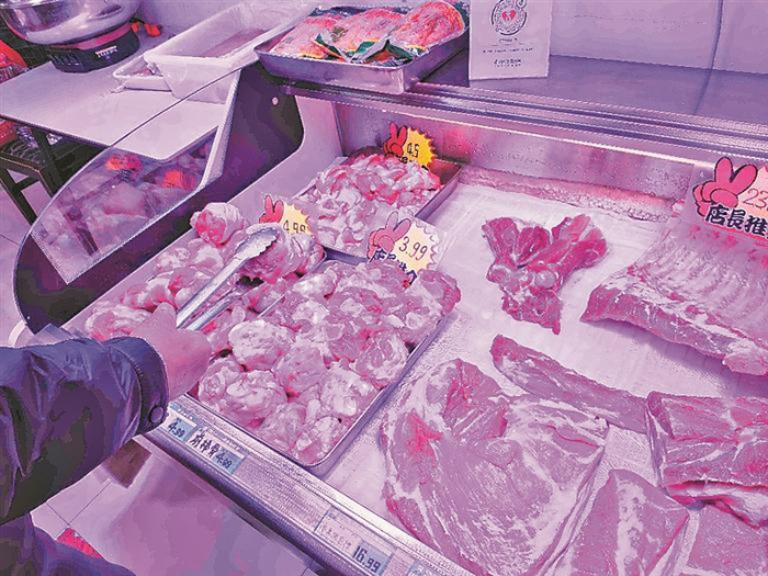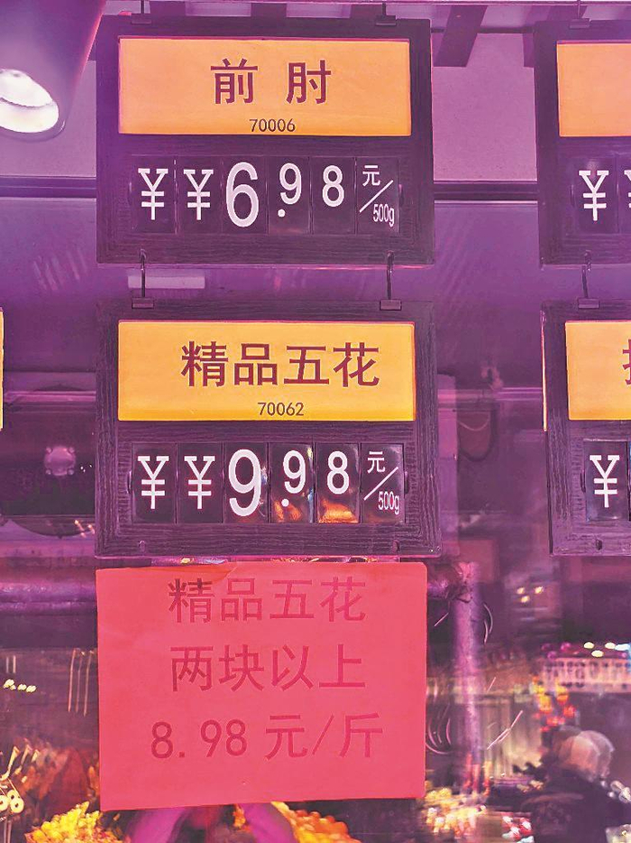 记者在道里区一家大型超市的猪肉摊前看到,猪肉价格跌破了5元关口,一家品牌猪肉的前槽肉售价为4.99元/斤,肘子的价格为7.99元/斤。附近一家生鲜店内,猪肉价格签上又叠加了打折的价格,买得多再打折。买整扇排骨由9.98元/斤降至8.98元/斤,买两块儿以上五花肉6.98元/斤。“这价格好几年没见了。”正在挑选肉品的陈阿姨表示,以前买排骨通常要二十多元,现在百元大钞能买一大扇,家庭做饭的成本确实降了不少。