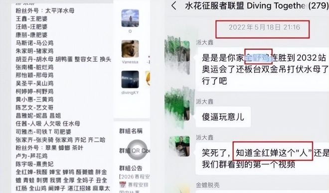 截图里,陈*汐、陈*文、昌*妮、龙*一这些跳水运动员的名字都有,不知道他们是不是也被针对过。事件爆发之后,有人选择了退群,退群时间被清清楚楚标了出来。还有些人没退群,最后被群主直接移出,估计是怕这些人泄露群里的聊天记录。