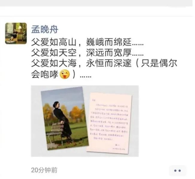 孟晚舟好像感受到了父亲的内疚,一封回信,似是有意要抚去父亲眉间的褶皱。