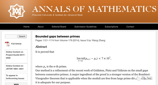 这篇文章首次证明了距离有限的质数对是无穷多的,在孪生素数猜想这一数论难题上取得质的突破。