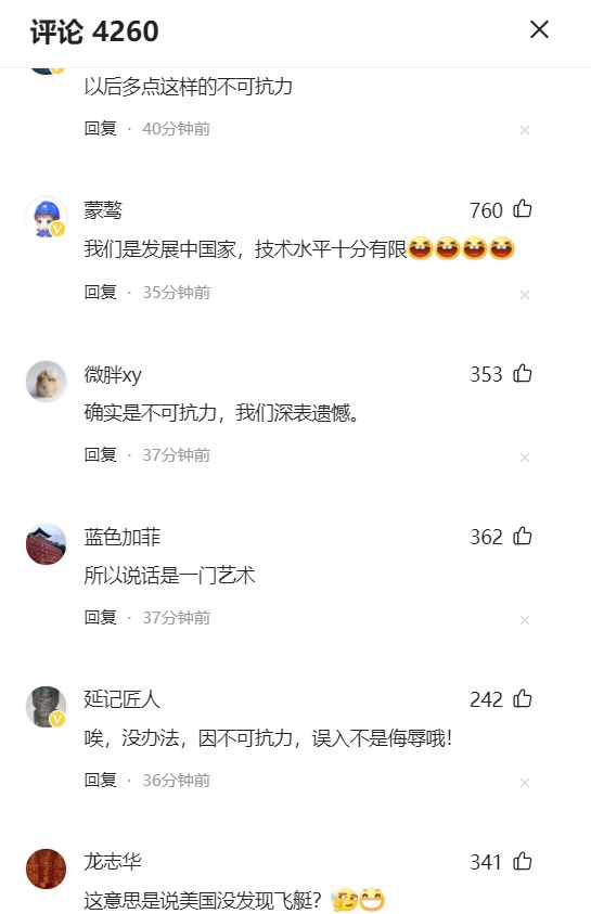 但是我对于网友的很多评论,我是非常的感兴趣,比方说很多网友就说,我们外交部的发言人的回答问题,恰如其分,说的因不可抗力,确实又不是故意的,表示遗憾即可。这个网友的评论非常的到位。还有网友说,我们也可以换一个花样,说我们国家这个高科技不行,自身控制能力有限,还在发展当中,这种意外是没办法的事情。所以我们中国的飞艇一不小心就飞到美国的上空去了,没办法。