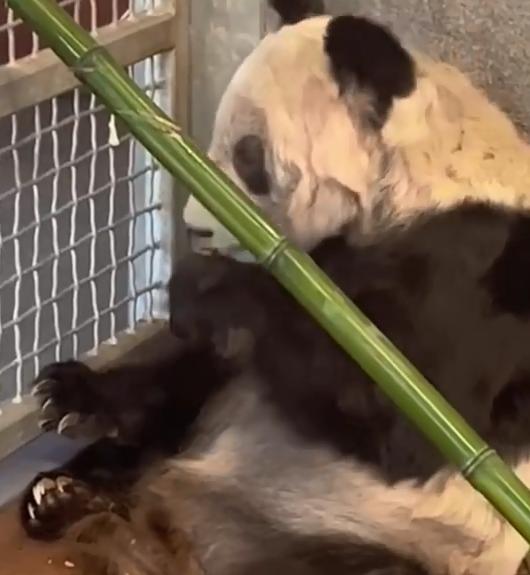 只见我们的国宝丫丫小心翼翼地拿着来之不易的一小节甘蔗正在慢慢咀嚼,但难免有一些渣渣掉到了肚子上和地上,它马上低头弯腰将这些渣渣都吃干净。看着它弯腰低头,我不免得有些心酸,不浪费食物自然是好的,但想到丫丫受到的一切虐待,甘蔗渣渣这种食物,对丫丫来说都是天上佳肴了。