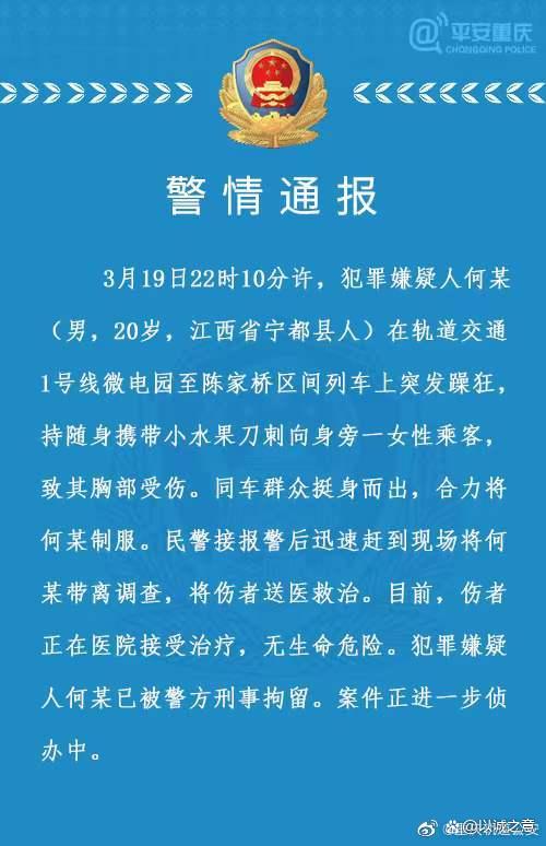 通报称,2023年3月19日晚上10时10分许,20岁的犯罪嫌疑人的何某(男,江西宁都县人)在重庆1号线列的一列地铁上因突发躁狂,持随身携带的小水果刀刺向身旁的一位女乘客,致女子胸部受伤。后在同车乘客不在畏生死的同心合力下,将嫌疑人何某制服,并移交给赶来的公安带走处理。受伤女乘客也被及时送医救治,无生命危险。