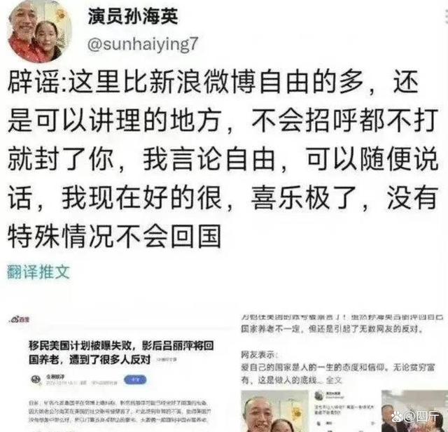 可惜观众将心与明月,明月却自己照沟渠了,孙海英和吕丽萍结婚后居然高调定居美国,并且还吃饱饭骂厨子,炮轰在中国言论不自由,在美国说什么都行。