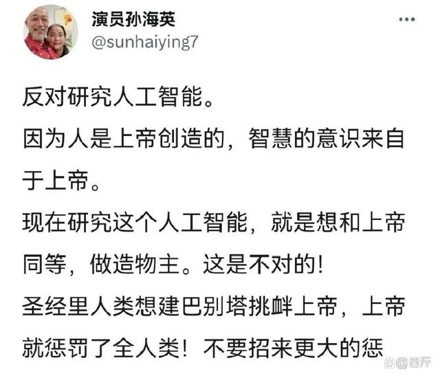 听说这些年孙海英和吕丽萍信了什么教会,天天拿上帝说事,四处演讲的时候还带着“十字”在胸前,甚至还公开反对研究人工智能,说什么人是上帝创造的,“智慧”来自上帝,研究人工智能就是挑衅上帝。
